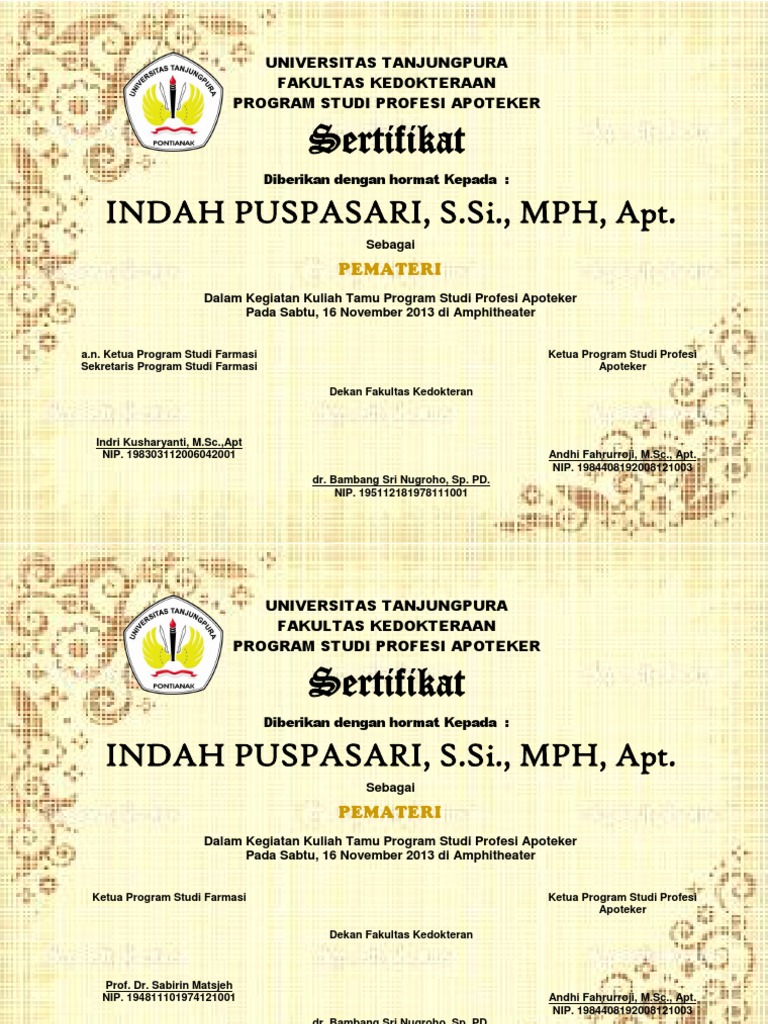 Sebagai PEMATERI Dalam Kegiatan Kuliah Tamu Program Studi Profesi Apoteker Pada Sabtu 16 November 2013 di Amphitheater Ketua Program Studi Farmasi Ketua Program Studi Profesi Apoteker Dekan Fakultas Kedokteran Prof. Dari segi format serta tulisan yang baik dan benar pada Contoh Sertifikat menjadikan acuan kredibilitas dari sang penulis. Contoh Sertifikat Untuk Pemateri - Semoga dengan Gawe CV post beberapa contoh Contoh Sertifikat dapat menjadikan anda lebih baik lagi dalam berkreasi serta menulis surat yang baik dan menarik.